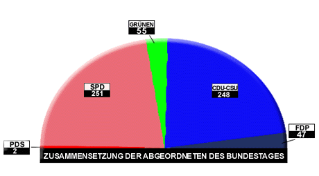 Gerhard Schröder wird damit erneut zum Bundeskanzler gewählt werden, Joschka Fischer wird Aussenminister bleiben. Die CDU-Vorsitzende Angela Merkel ist zur Vorsitzenden der CDU/CSU-Bundestagsfraktion gewählt worden. Die FDP wird im Parlament weiterhin vom Fraktionsvorsitzenden Wolfgang Gerhardt geführt.